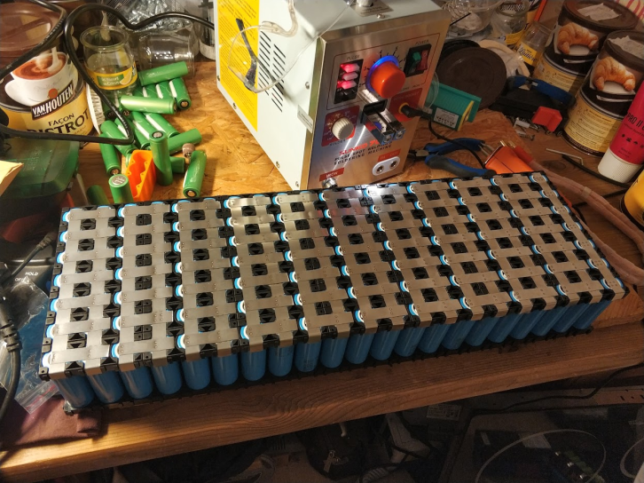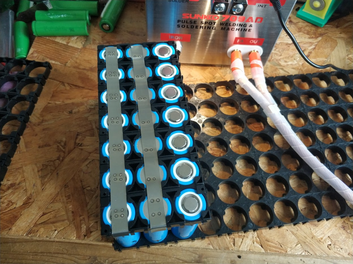 A l'aide d'une machine de soudage par points, on vient souder des languettes de nickel sur des cellules (sorte de grosse pile, composant principal de la plupart des batteries des objets courants)
